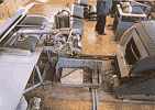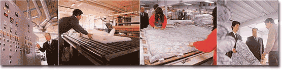 まず、社長の案内で第1工場を歩く。ちょうど、掛ふとんがラインに乗っていた。原料の綿は、メキシコから輸入されたもの。 ふとんの良し悪しは、この原料選びによって大きく左右される。メキシコ綿は、センイが長くて弾力性がある。だから、寝心地を重視する ふとんにはもってこいなのだ。敷ふとんにはインドから輸入されたデシ綿が使われていた。
