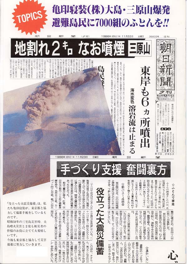 画像の小ささから記事がよく分からないと思いますがこのときは掛けふとんと敷きふとんで14000枚、枕7000個、カバー、 シーツ各7000枚…交換分を含めて数え切れない数になりました。でもみんなの手助けができてよかったです。 亀印寝装=現、株式会社カメックス